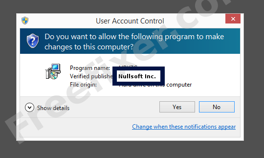 You will probably notice Nullsoft Inc. when running the file. The publisher name shows up as the "Verified publisher" in the UAC dialog as the screencap shows: